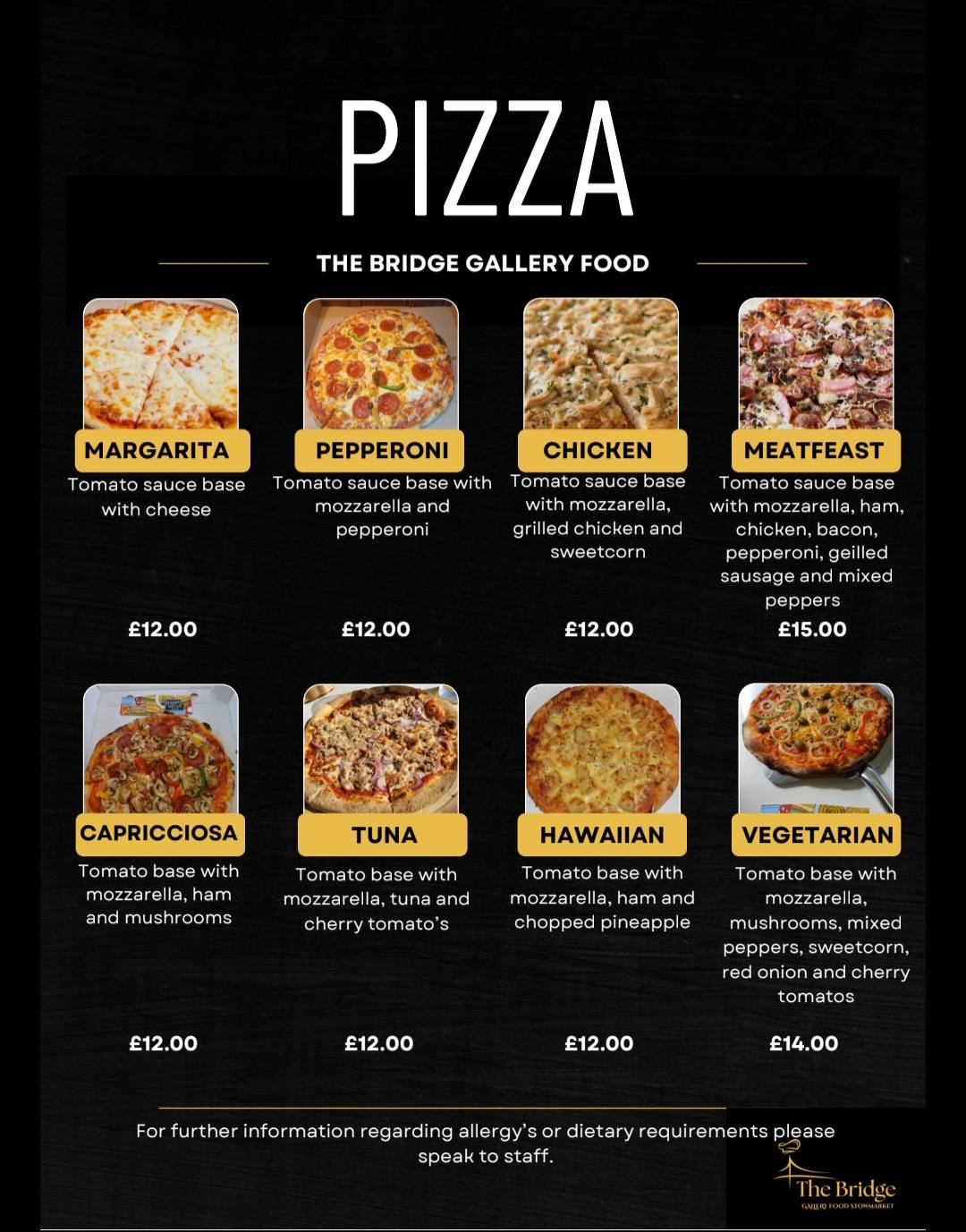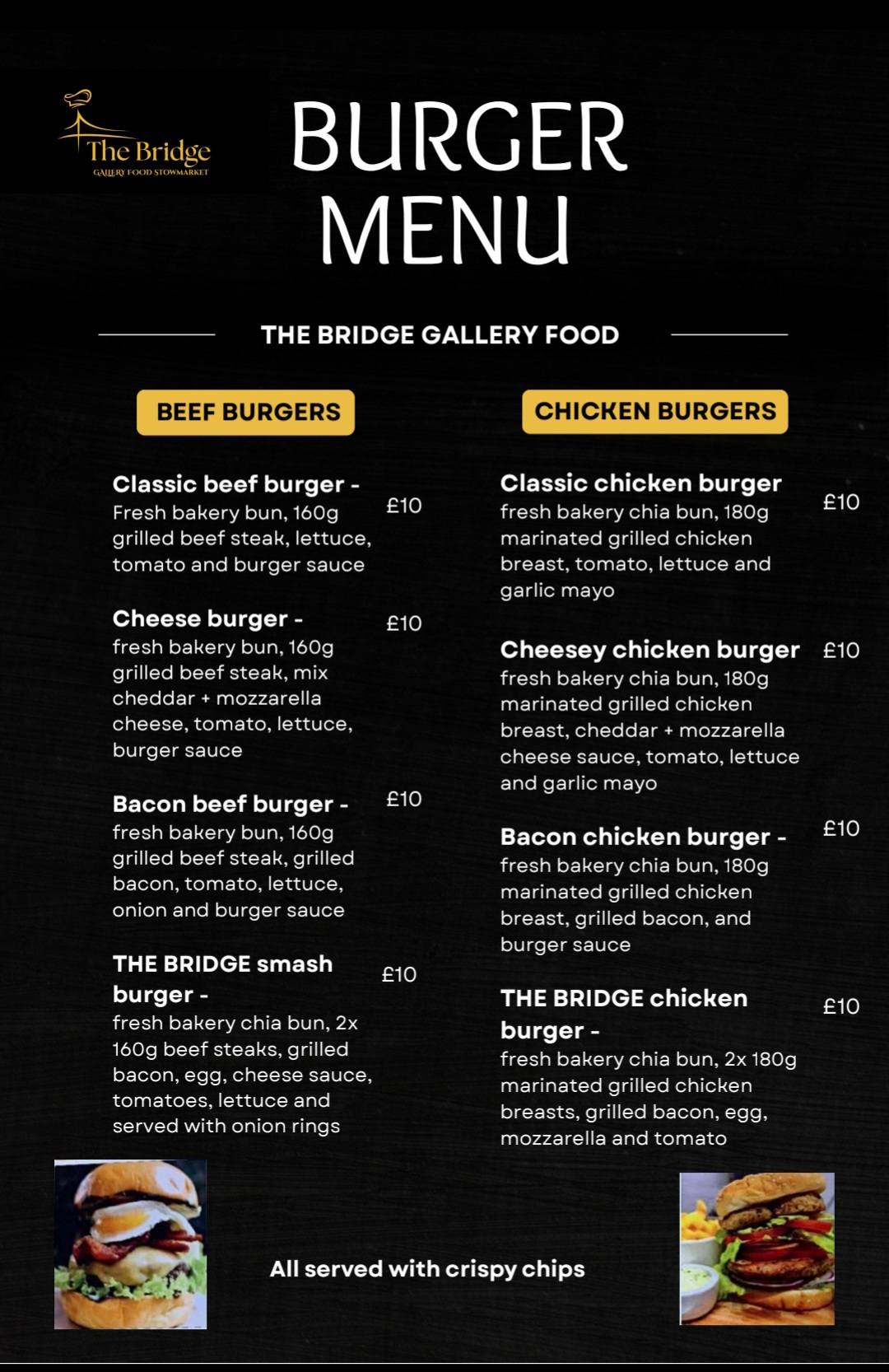 The Bridge Gallery Food brings together great food and a relaxed gallery atmosphere in the heart of Stowmarket. What started as a love for vibrant Mediterranean flavours has grown into a menu that also celebrates British and continental favourites.We focus on fresh, locally sourced ingredients and homemade recipes, from hearty breakfasts and comforting classics to pizzas, burgers, pastas and seasonal specials. Whether you’re stopping by for a quick bite or sitting down to enjoy a proper meal, you can expect generous portions, warm flavours and a friendly welcome every time.